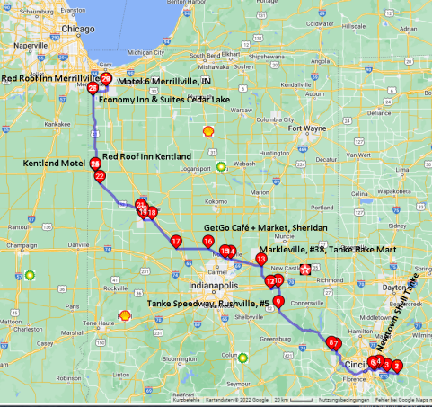 Häh??? Ist erst 14:15, hab zwar den Staat noch nicht verlassen, aber schon in die Chicagoer Zeitzone gewechselt, Eastern zu Central, mit Daylight savingtime = Deutschland-8