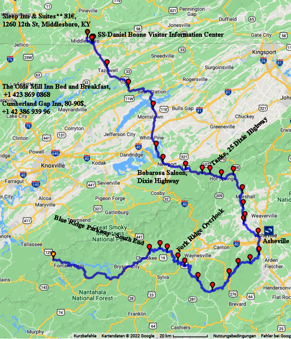 07:35 Aufbruch. wieder mal der Moonshiner (HWY 28) für ca. 50km, davon 40 empfehlenswert, dann auf den Blue Ridge Parkway.