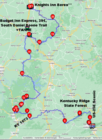 In den nächsten Stunden cruise ich durch Kentuckys Landstraßen, Qualität von "italienische Passstraße" bis "kleine Landstraße im Sauerland", je nach Höhenlage. Perfekt!