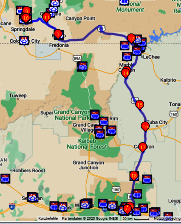 Und ja, ich muß so fahren, dazwischen liegt der Grand Canyon...