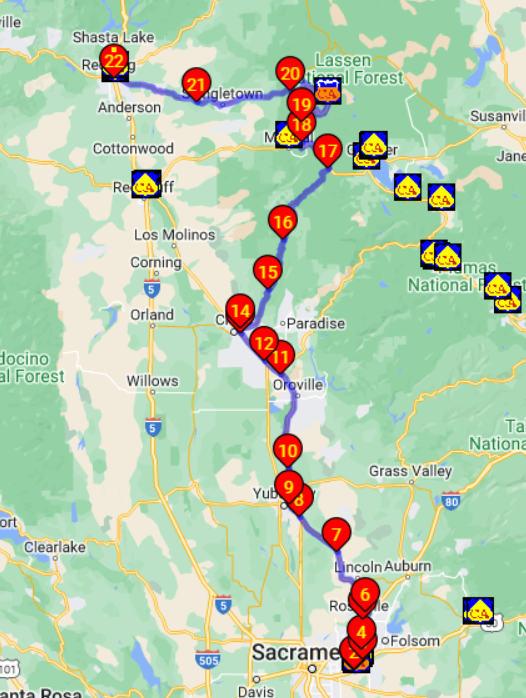 Da in den Bergen entweder alles ausgebucht oder unglaublich teuer ist, gehts von Mather nach Redding etwas unterhalb der Parks weiter. (und ich war schon da...)